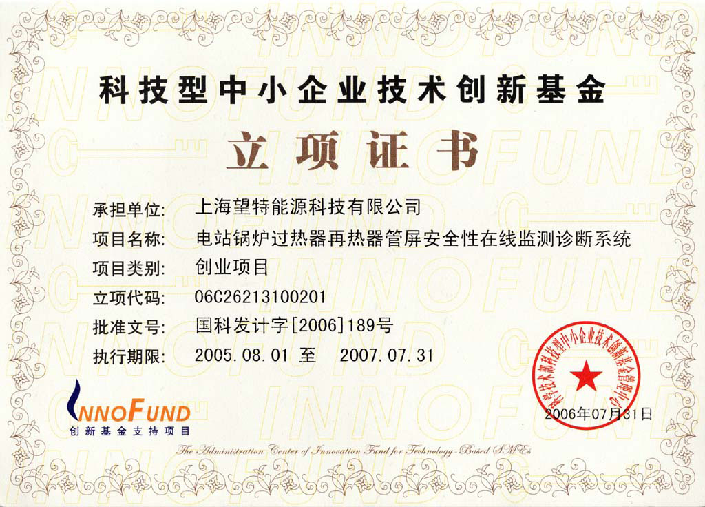 國家科技部創(chuàng)新基金證書
