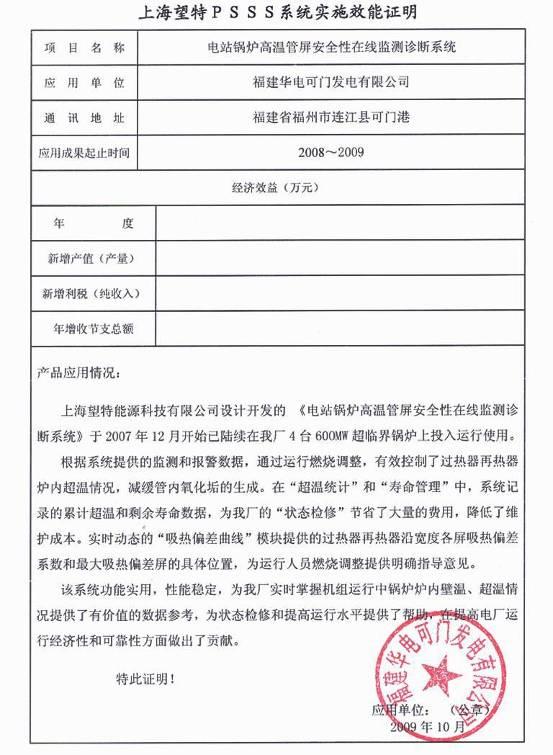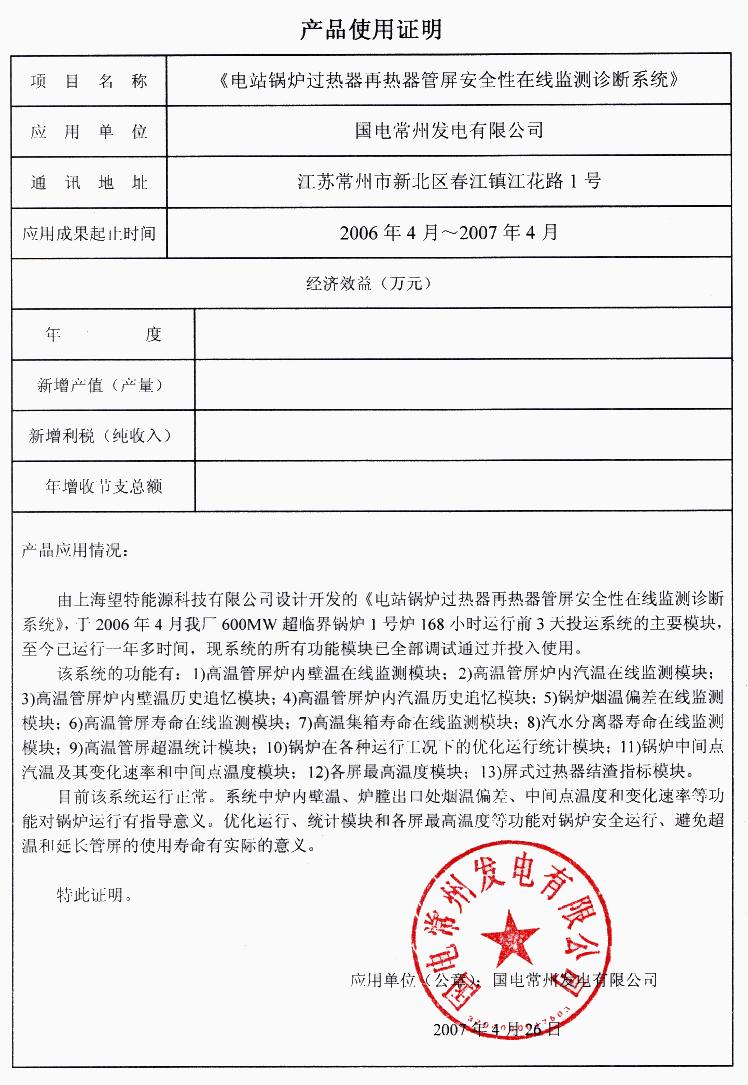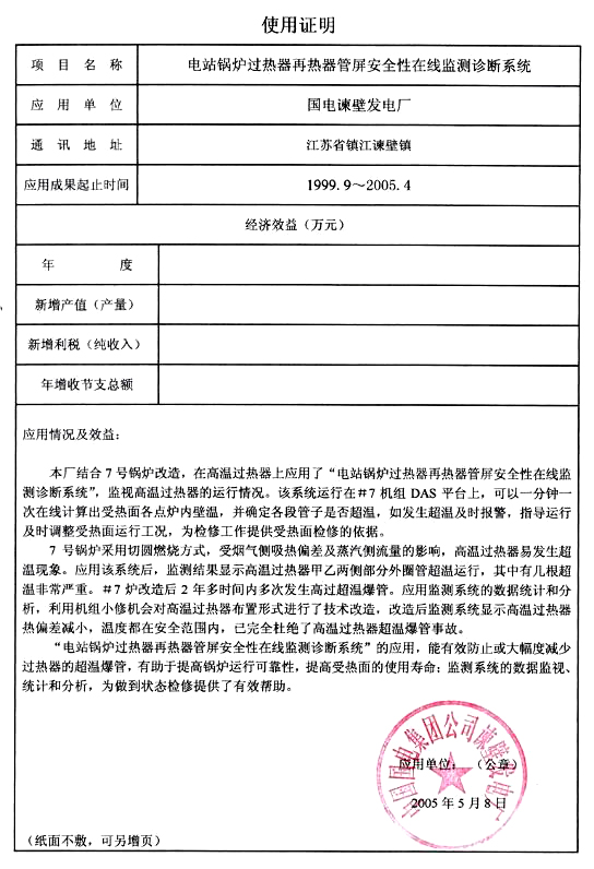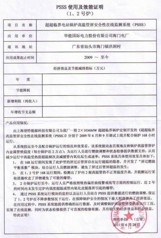 漕涇2號爐系統(tǒng)使用證明 國電諫壁13號爐應用證明 華能海門電廠1、2號